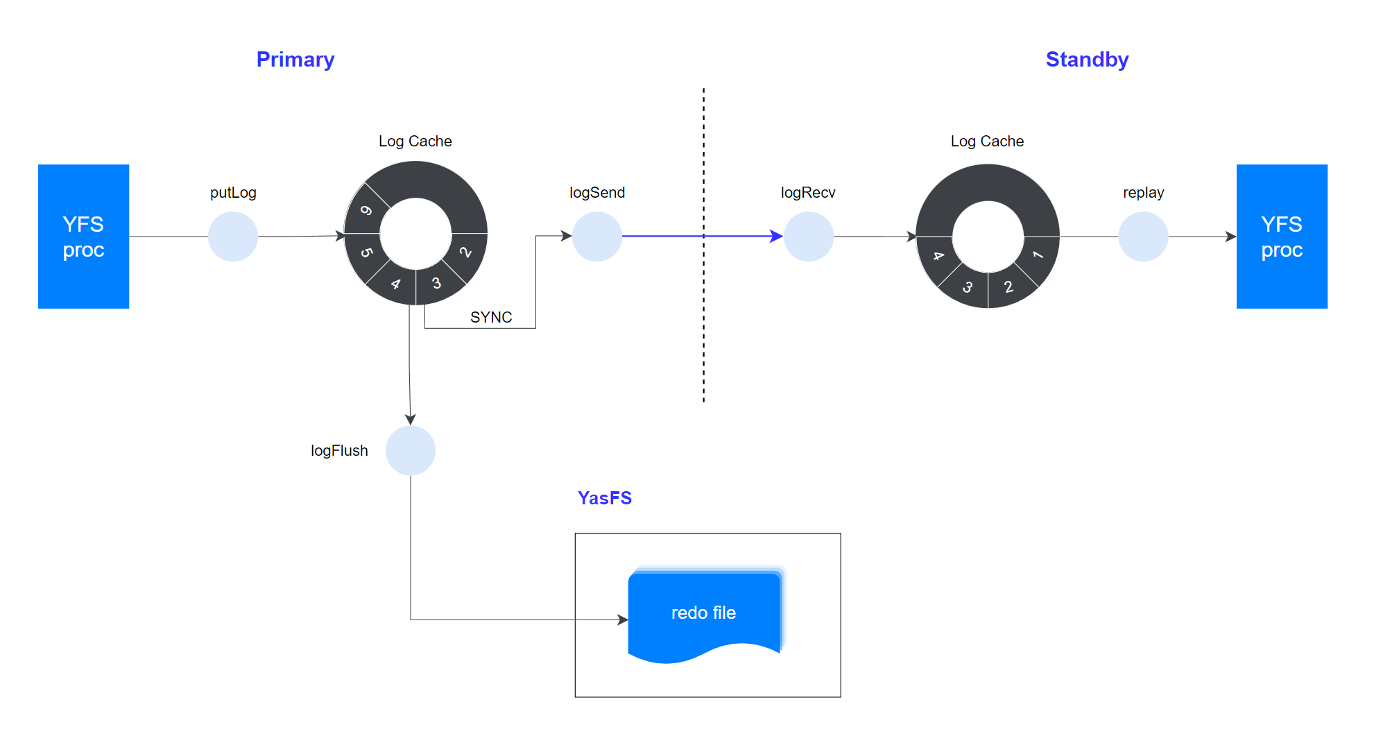 YFS 集群至少包含 1 个主实例(Primary)和若干备实例(Standby)。主实例负责处理所有元数据变更,同时将产生对应的 redo log,插入 Log Cache。