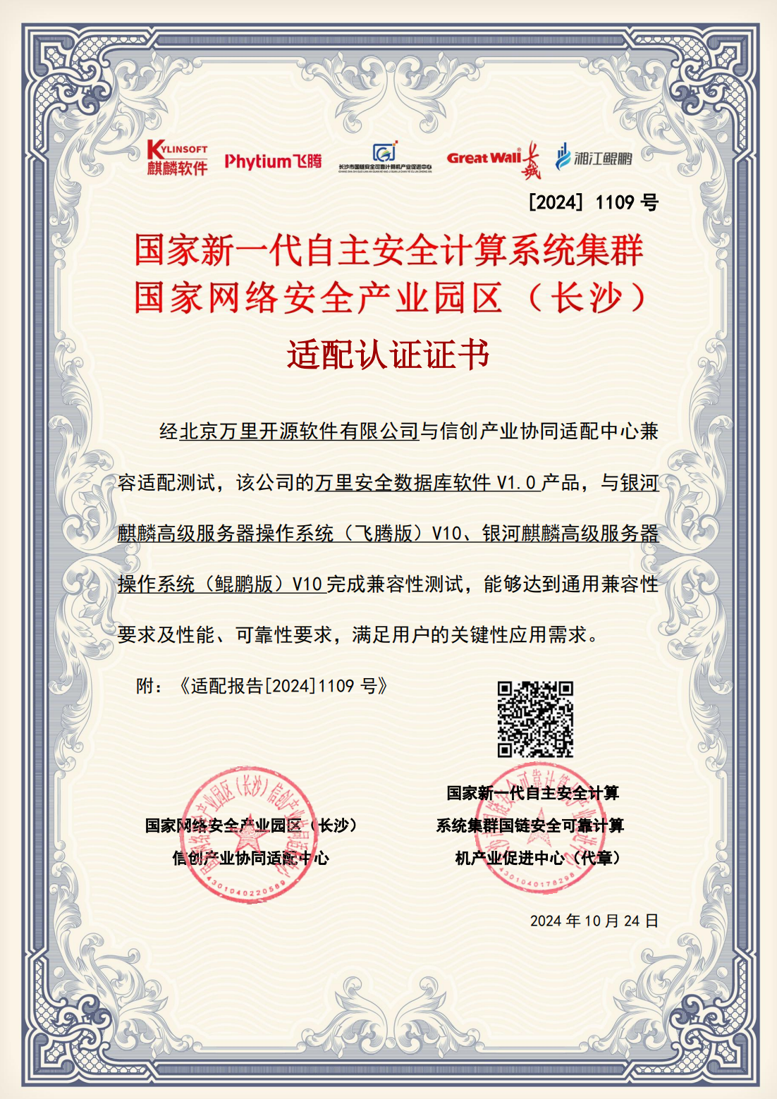 近日,万里数据库与湖南省信创产业协同适配中心完成了“两芯一生态”的产品兼容适配工作,并获得证书,安全数据库GreatDB产品能力及国产生态体系建设成果获得省级适配中心验证。
