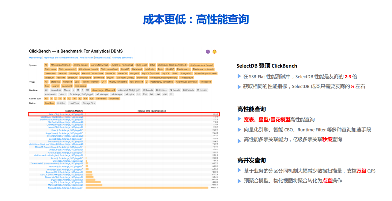 SelectDBCloud:全托管的实时数据仓库服务,支持SaaS和BYOC两种模式,多云原生,当前已经上线阿里云、华为云、腾讯云和亚马逊云科技;SelectDBCloud有着极致的查询分析性能,具体表现如下图: