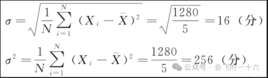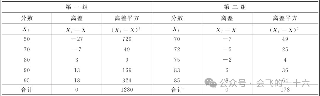 计算结果说明,虽然两组同学平均考试成绩均为77分,但第二组的标准差(6分)和方差(35.6分)小于第一组的标准差(16分)和方差(256分),所以第一组平均数的代表性小于第二组。