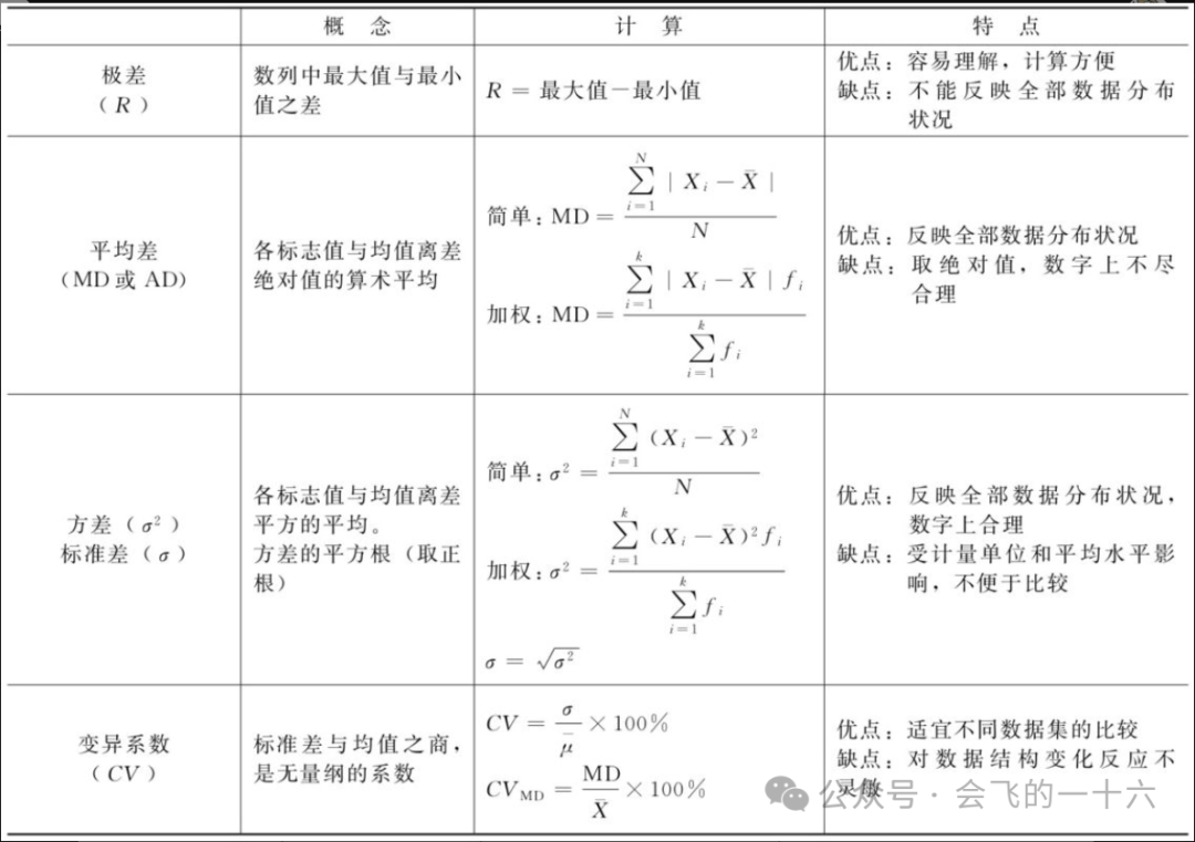 常用的指标离散趋势指标有极差、平均差、方差、标准差、变异系数等。 极差又称全距,是指总体各单位标志值中最大值与最小值之差,表明标志值的变动幅度和范围。用公式表示为 根据例1资料计算的极差为第一小组:极差=95-50=45(分);第二小组:极差85-70=15(分)。计算结果表明,虽然两个小组的平均成绩都是77分,但成绩的极差第二组小于第一组,说明第二组的平均数代表性高于第一组。极差计算方法简便,意义明确,容易理解,在实际工作中常用于粗略说明被研究对象的变异程度大小。但极差只考虑了总体单位标志值的最大和最小两端的数值,没有考虑中间各项数值的分布和影响,所以不能全面、准确地反映现象的离散程度。平均差是总体中各单位标志值对其算术平均数的离差绝对值的算术平均数。由于它考虑了数列中各项标志值变动的影响,因而克服了极差的不足,能够全面反映所研究总体的平均差异程度。平均差通常用字母MD表示。由于各标志值与其算术平均数的离差之和等于零,所以各项离差的平均数也等于零。在计算平均离差时,为了避免正负离差相互抵消,先取离差的绝对值,再求离差绝对值的平均数,即平均差是平均绝对离差的简称。根据所掌握的资料不同,平均差有简单算术平均差和加权算术平均差两种。2.1 简单算术平均式