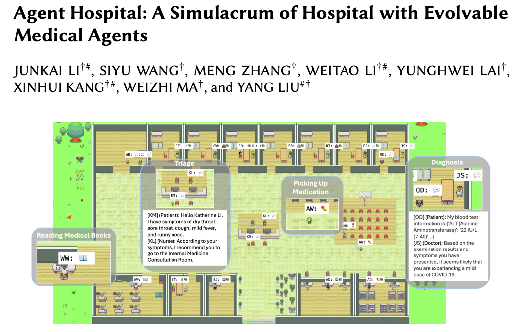 本研究介绍了一个名为 “ Agent Hospital ” 的医疗模拟系统,该系统复现了疾病治疗的全流程。在这个系统中,患者、护士和医生均由先进的大型语言模型(LLM)支持,以实现自主操作。该系统的核心目标是训练医生代理掌握在模拟环境中治疗疾病的能力。为此,研究团队开发了一种创新的方法——MedAgent-Zero。由于该系统能够依据知识库和LLM模拟疾病的发生与演变,医生代理能够通过分析成功与失败的案例来积累临床经验。实验结果表明,医生代理在执行各种任务时的治疗技能得到了显著提升。这项研究为将LLM驱动的代理技术应用于医疗领域奠定了基础。