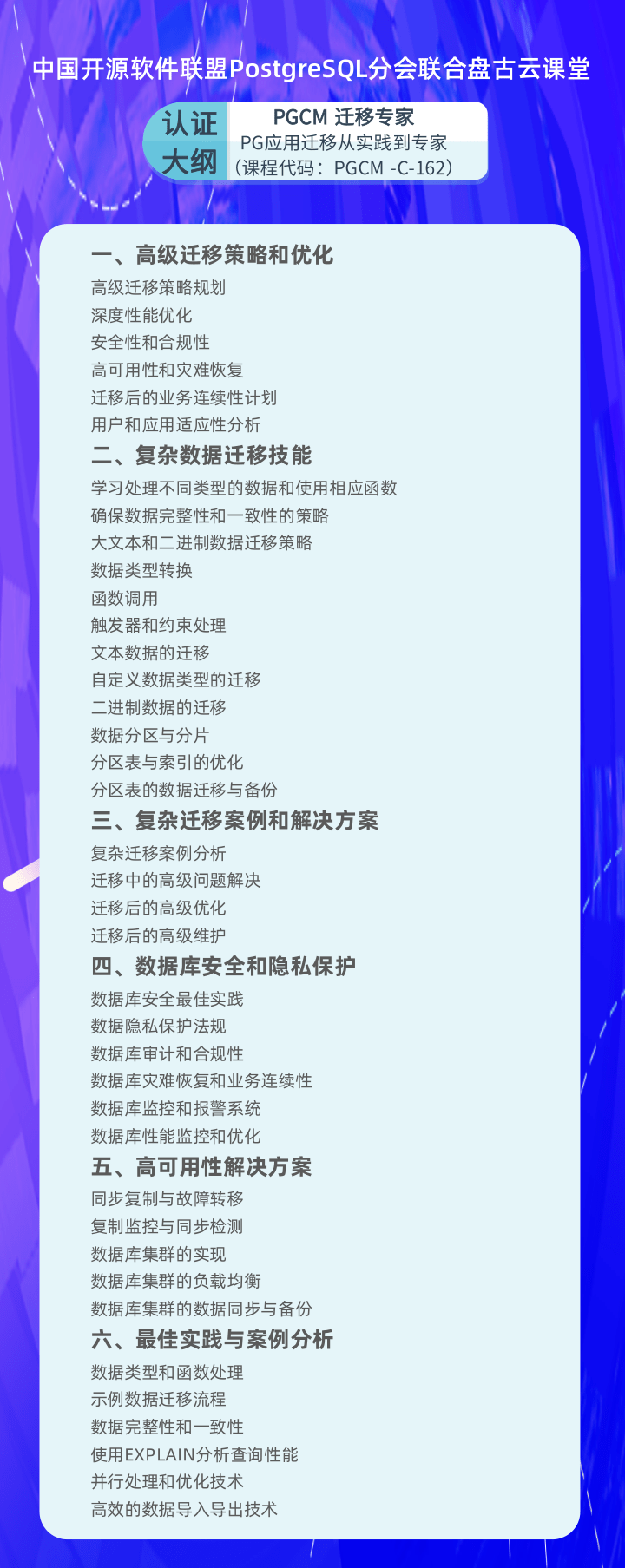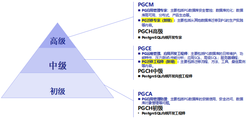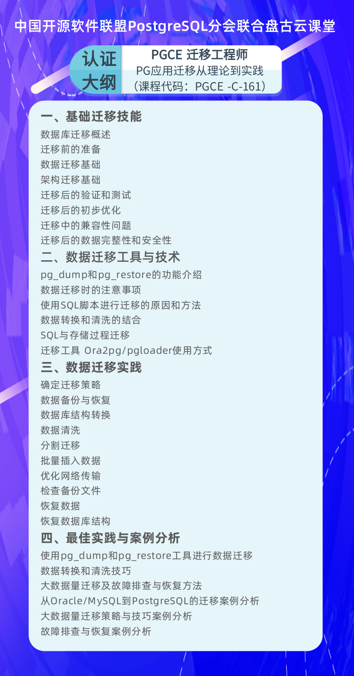 随着PostgreSQL主版本稳定迭代、功能不断增强,国内有越来越多的企业用户通过将其它数据库迁移到开源PostgreSQL上来,实现降本增效,为了更好的服务于企业的迁移需求,提供更专业的人才保障,由中国PG分会牵头指导推进“迁移方向”权威考核与认证,由盘古云课堂率先开展“迁移专业”系统化培训,加强“迁移能力”安全风险意识,并提升“迁移教培”水平和科技自信。现面向中级PGCE、高级PGCM拓展数据库迁移方向的培训认证课程。由中国PG分会与盘古云课堂联合打造,为学员赋能PostgreSQL数据库迁移能力。