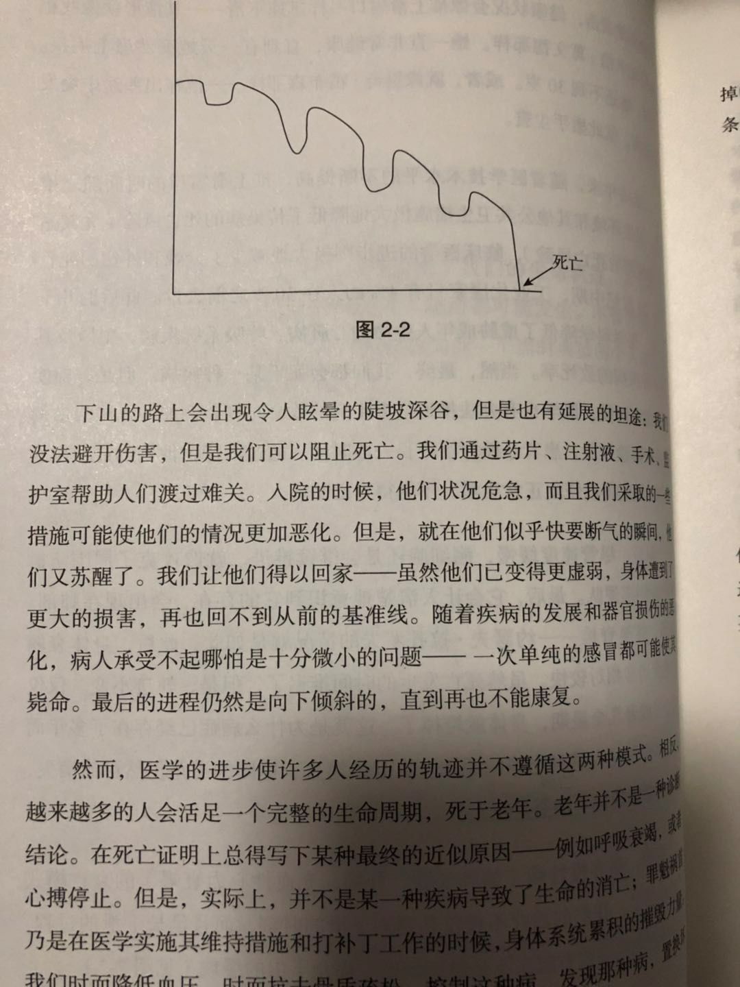 随着公共卫生水平的普及和提高,很多慢性病(比如肺气肿,肝病等)衰老模式已经减缓了,但是这个过程就好像陡峭的下坡路一样。虽然可以通过药物,手术等方式帮助我们临时渡过难关,但是我们的身体指标其实已经不如从前,这一点从30多岁的时候开始会有一个明显的感觉,对我来说前几年写个东西熬熬夜都没什么,现在有好几次都是坐着睡着了。