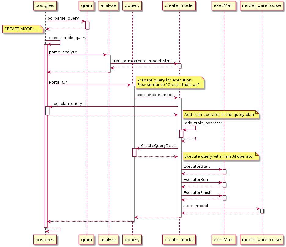 在机器学习算法进行训练后,生成的模型需要进行存储,以便后续推理进行使用。训练过程的时序图如下:在训练过程中,最后一步是通过调用store_model接口,在系统表gs_model_warehouse中插入一条记录,用于存储该训练算法及超参信息,以便开发者和调用者观测模型训练的结果,方便定位和调优。系统表gs_model_warehouse结构下表所示: | | |