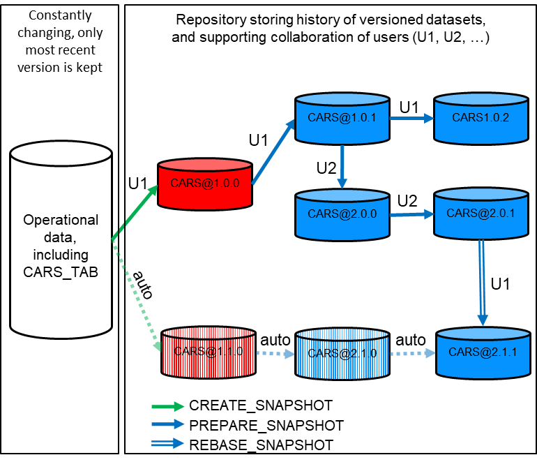 本示例中,准备的快照以“db4ai.cars@1.0.0”的当前状态开始,并在“cars”快照中新增一列“year”,同时删除与用户无关的列“make”。第一个示例使用短SQL表示法,其中各个语句由用户提供SQL片段。除了这个语法, ML-API还接受标准SQL语句(第二个示例),这些语句往往略为冗长。INSERT操作显示了将新数据导入已有snapshot中。UPDATE操作显示在新数据中新增列“year”,最后DELETE操作显示如何从快照中删除过时的数据。此次调用后快照的名称是“db4ai.cars@2.0.0”。最后的可选参数允许用户将描述性文本注释与这个调用PREPARE_SNAPSHOT对应的工作单元相关联,以用于更改跟踪。由于所有快照的定义都是不可变的,所以PREPARE_SNAPSHOT创建一个单独的快照“db4ai.cars@2.0.0”。最初作为父快照“db4ai.cars@1.0.0”的逻辑副本,并应用任意复杂的SQL参数的更改,该更改对应于数据管理中的整数工作单元。与SQL脚本类似,此操作在已准备好的快照上的逻辑副本上连续执行,父快照保持不变,不受这些更改的影响。操作本身允许使用者从父快照中删除列,或添加新列,例如用于数据注释。通过INSERT可以添加行,例如从操作数据源或其他快照添加行。作为数据清理过程的一部分,可以删除不准确或不相关的数据,而不管数据来自不可变的父快照还是直接来自操作数据存储。最后,UPDATE语句允许纠正不准确或损坏的数据,为缺少的数据提供数据填充服务,并允许将数值标准化为通用尺度。 总之, PREPARE_SNAPSHOT设计用于支持数据管理中的所有周期性任务:数据清理:删除或更正无关、不准确或损坏的数据