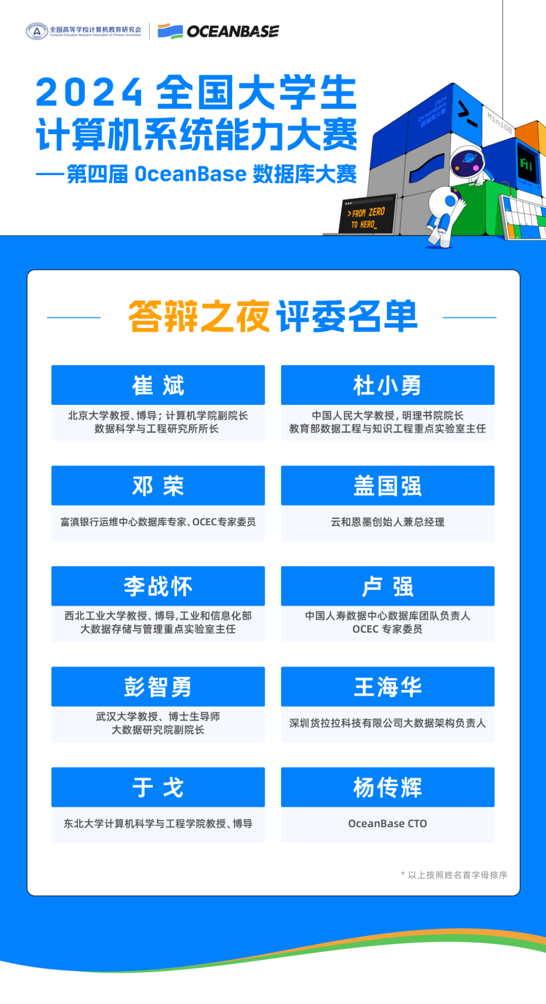 2024 全国大学生计算机系统能力大赛——第四届 OceanBase 数据库大赛,是由系统能力培养研究专家组倡议发起,全国高等学校计算机教育研究会与系统能力培养研究项目示范高校携手主办,并由OceanBase具体承办的一项面向全国高校学生的数据库专业竞赛。该赛事旨在借助学科竞赛的形式,促进计算机专业教育的发展与创新人才的培养,为杰出计算机人才的成长构建一个集交流、展示与合作于一体的开放舞台。