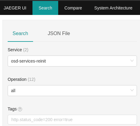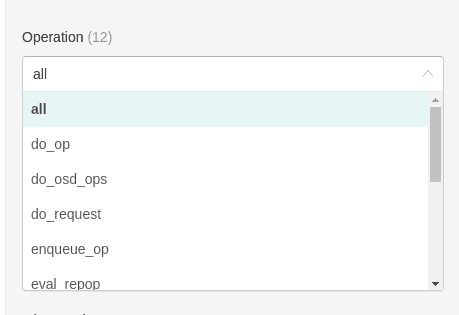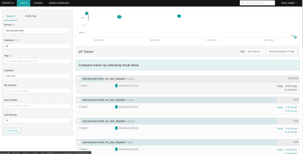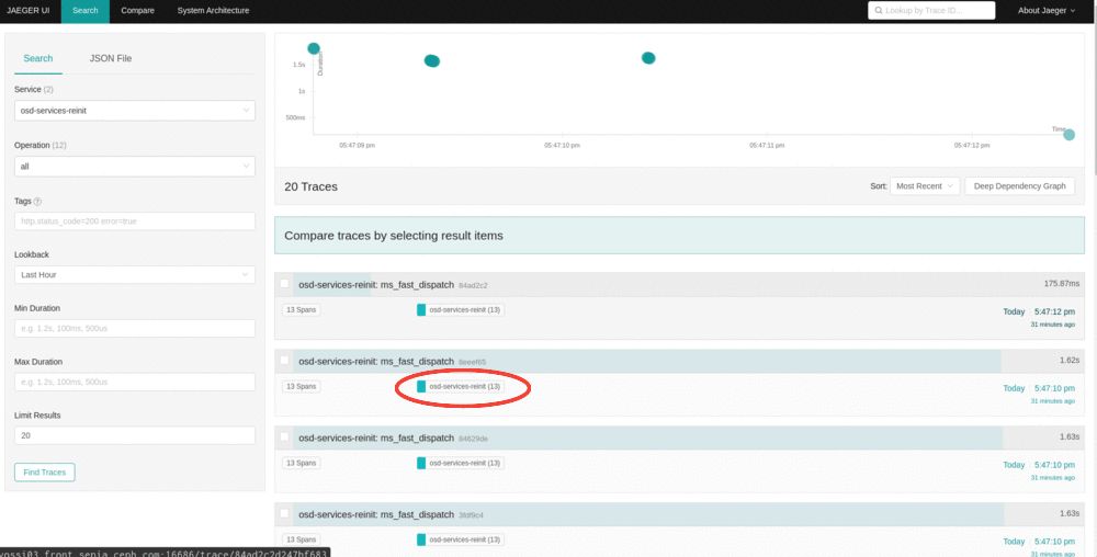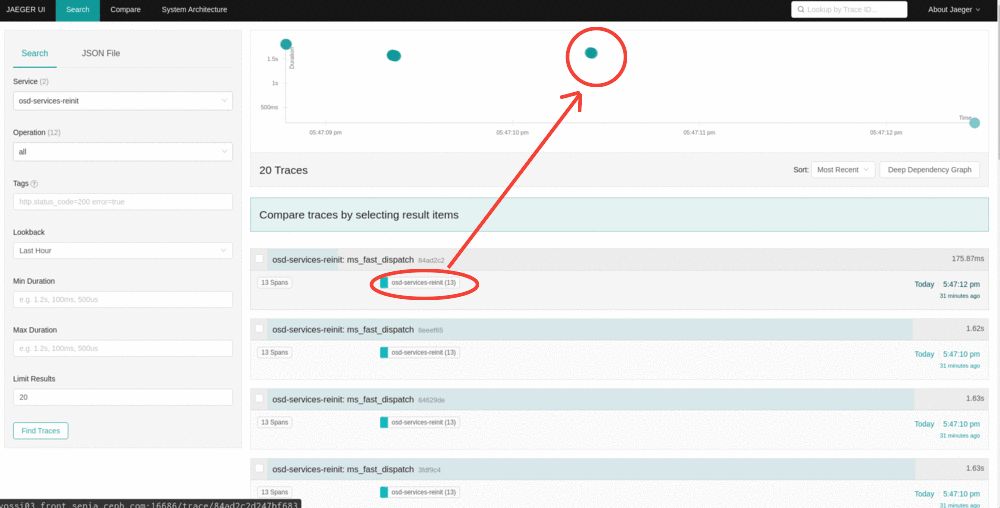 在刷新 JaegerUI ( http://localhost:16686 ) 时,您应该能够在 services 字段中看到 osd-services,它指定了请求生命周期中跟踪的 OSD 进程。正下方是“操作”字段,其中列出了收集的跨度,单击该字段将为您提供包含它的跟踪。我们看到了我们最近的写操作收集的轨迹列表,以及一个 x(time)-y(duration) 图,轨迹作为数据点。