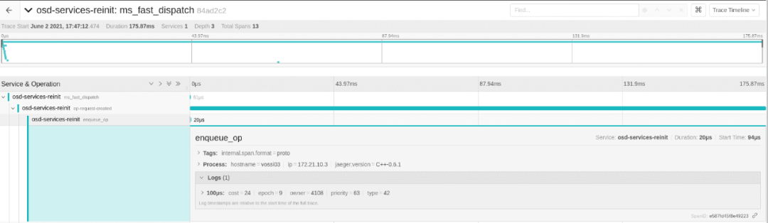 当您单击任何跟踪时,它应该扩展到存储在其中的所有跨度和元数据。我们可以在创建跨度时以标签和日志的形式存储 Ceph 的元数据,如下所示;携带 Ceph 相关元数据的日志字段。