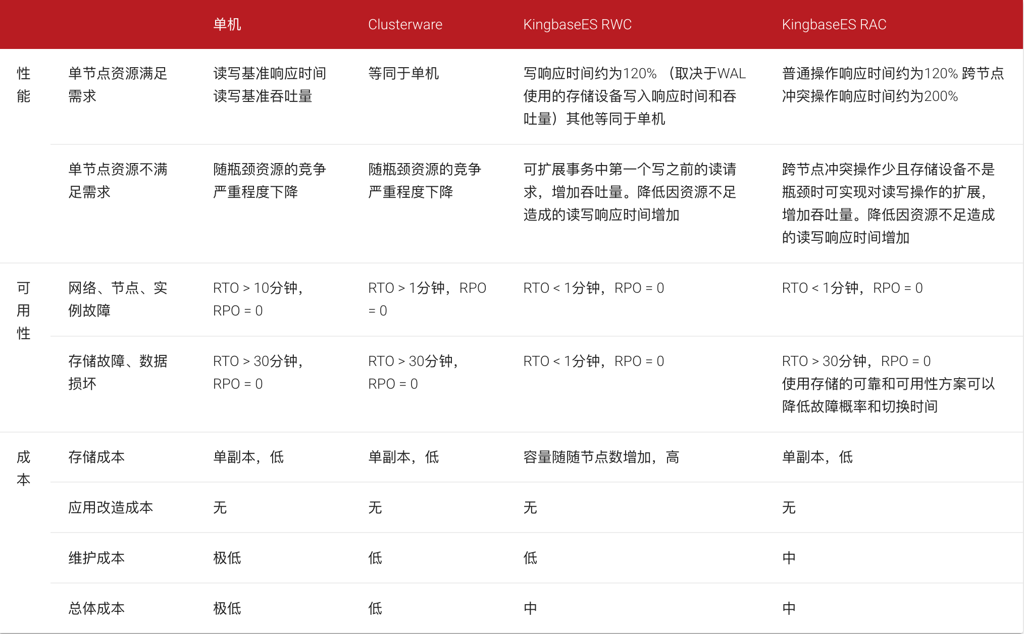 下表从性能、可用性和成本角度详细描述了共享存储集群方案和 KingbaseES 的其他方案的差异: