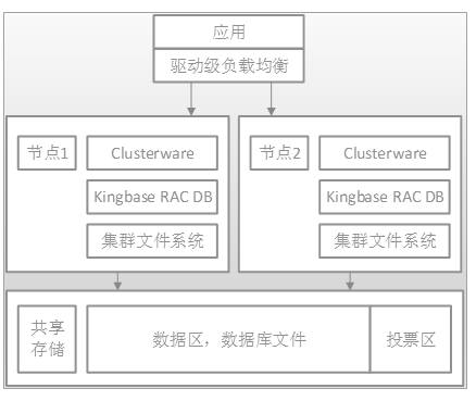 逻辑架构:KingbaseES 提供了数据库的连接驱动,实现了客户端的负载均衡,并且支持连接级,在每个节点上提供了Clusterware 软件,管理集群中的成员,进行故障检测,处理数据库的调度问题,新增的 KingbaseES RAC 数据库提供跨节点一致的读写服务,集群的文件系统支持各节点对共享存储的一致性访问。当前的 KingbaseES RAC 还不支持 Oracle 的 ASM 设备管理方案,是依赖于本身的可用可靠方案来实现的。