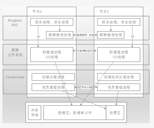 运行架构:KingbaseES RAC 集群进程支撑维护全局一致性,提供节点管理、封锁、缓存交换等功能。集群文件系统提供锁管理进程,进行跨节点并发控制,提供 I/O 进程完成数据存取。Clusterware 故障检测处理进程提供故障检测以及自动处理,成员管理进程提供全局一致的成员列表。