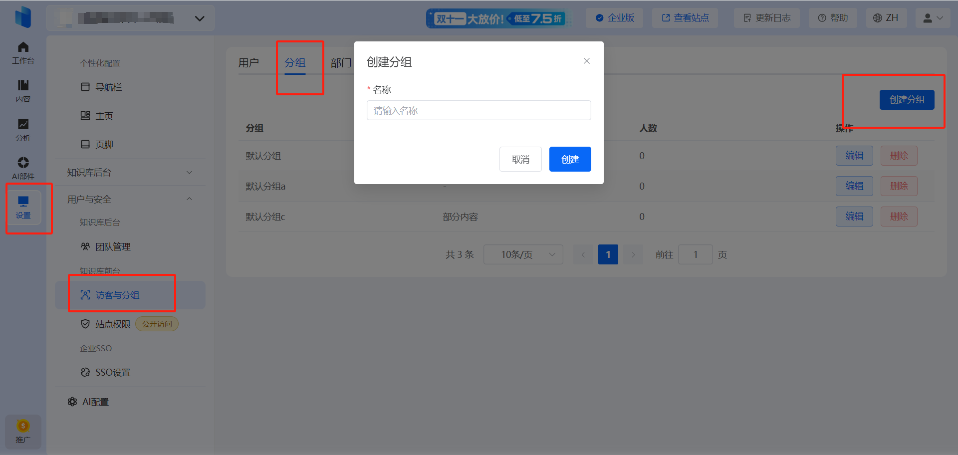 还可以在分组栏中右上角的【分组管理】可以编辑当前用户所属分组,支持配置多个分组或无分组。