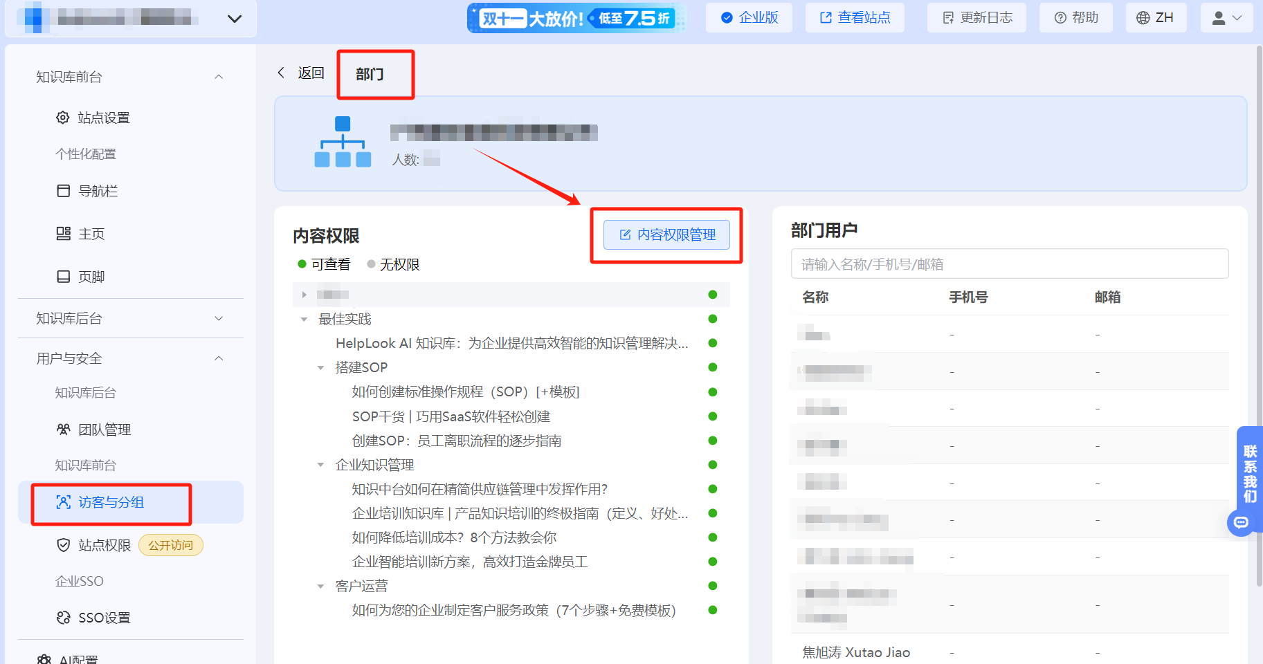 企业在成功同步组织架构后,企业成员信息会自动同步到【访客与分组】模块里,用户类型设置为“企业用户”,管理员可直接管理组织架构下,对应部门成员的内容权限。