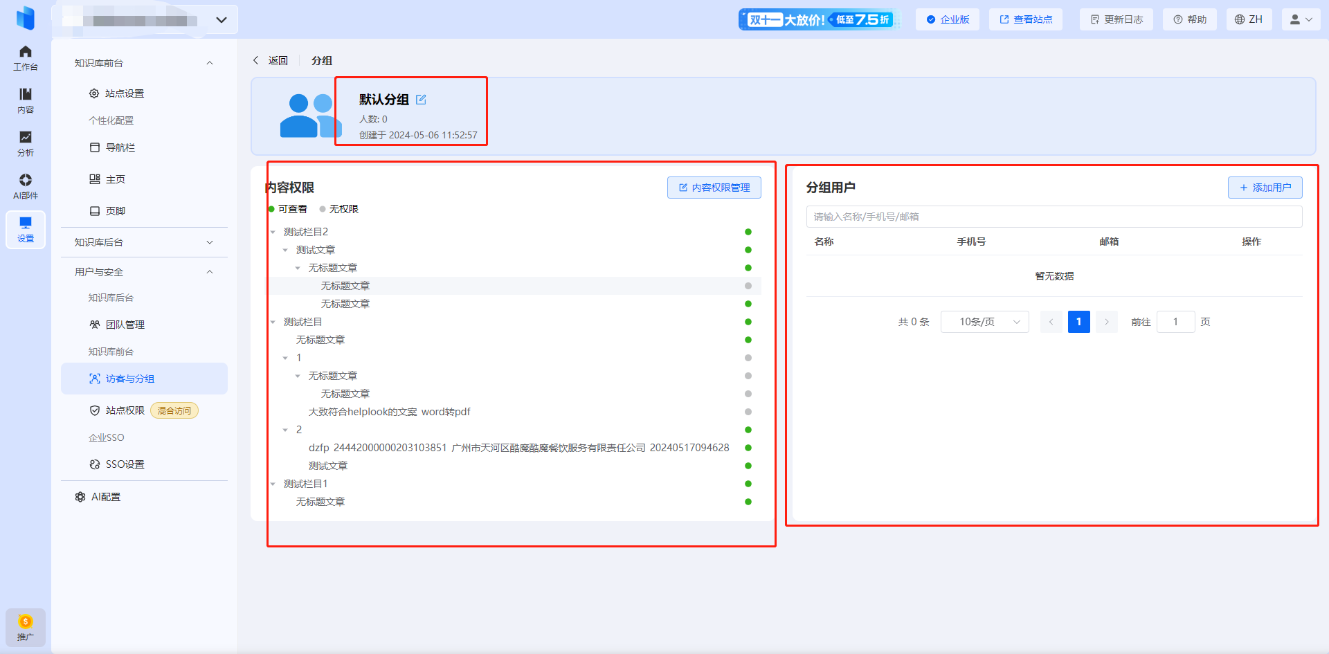 ②按分组授权:通过分组直接赋权,简化复杂的权限结构。特别适用于中大型企业或需对多类型成员进行分类的企业知识库。在分组详情页,你可为整个分组统一配置内容权限,实现批量管理。