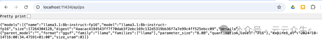 请注意,Ollama 可以从内存中卸载,因此请查看此 API 响应以确认模型已加载: