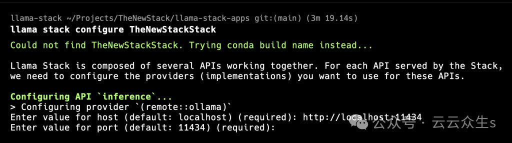 但是,我运行了给定的行,我们得到了一个交互式表单,我们需要将推理提供程序与“远程”Ollama 服务器配对。其他使用的条目是 Meta 提供的默认值: