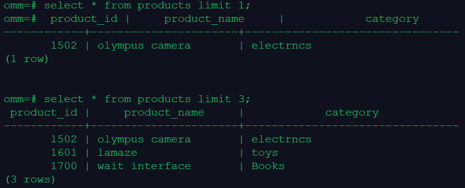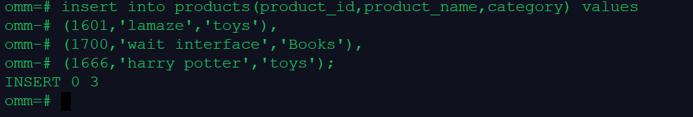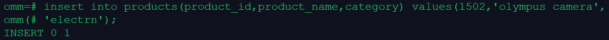insert into products(product_id,product_name,category) values(1502,'olympus camera','electrncs');