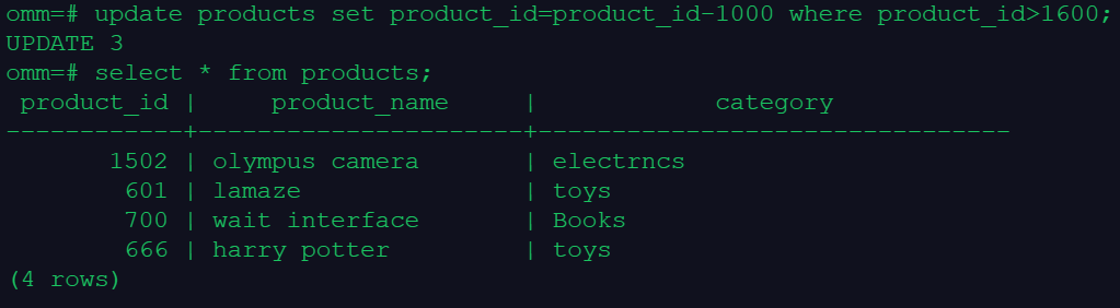 (四)、将满足product_id >1600的记录的product_id更新为product_id - 1000,并查看products中所有记录是否更新成功