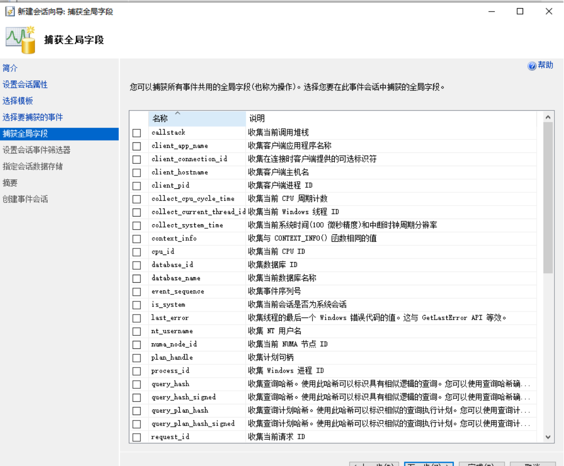 这里选择client_app_name、client_hostname、database_id、database_name、plan_handle、query_hash、request_id、session_id、sql_text字段