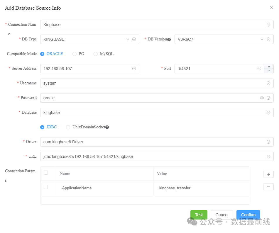图形界面配置数据源非常简单,在界面相应的位置填写数据源类型、数据库IP地址、端口、名称,数据库连接驱动、登录的用户名和密码等等一系列信息后,即可完成数据源的配置。配置完成后点击“测试”,如果连接成功会弹出“测试连接成功”的提示,如果失败则会显示出错误原因,便于用户进一步分析。