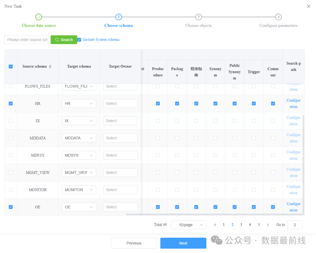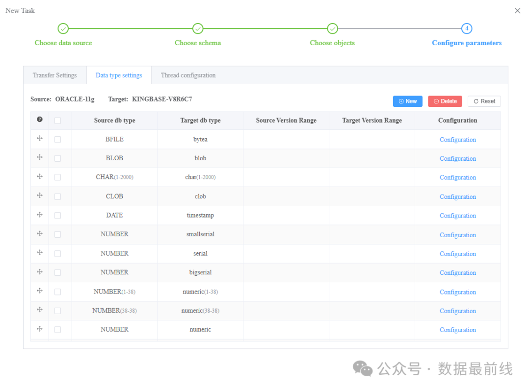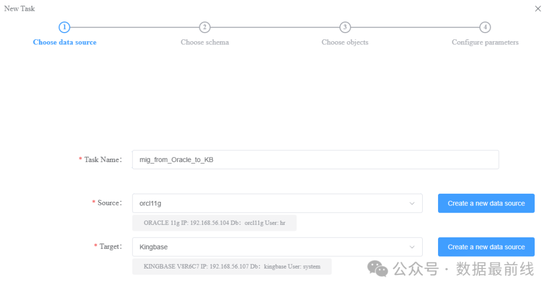 创建迁移任务是向导式的,根据提示依次选择需要迁移的源和目标数据库,