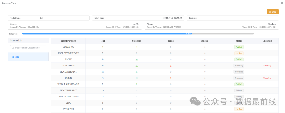虽然只是个简单的测试任务,不出意外的仍然失败了,任务进度一直停留在73.56%,之后发现是由于目标数据库空间满了,但迁移工具中没有其他更清晰的日志告诉用户问题到底出在哪。