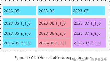 Clickhouse 批量数据插入形成一个最小的存储单元,称为Part,每个Part中的数据按照主键排序,表是由多个Part组成的。ClickHouse 的表通常都比较大,因此表中的数据通常都是先按照分区键被划分为多个分区,分区键常采用日期的方式,比如下图中按照月份分区。分区表的Part归属于某一个分区,为了实现高效的数据存储,ClickHouse会在后台定期对归属于同一个分区的Part进行合并。
