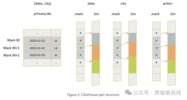 查找primary.idx并找到对应的Mark集合(即数据block集合); 对于要读取的每个列根据.mrk文件定位到Mark对应在数据文件.bin中的数据offset; 读取到对应的数据,供后续计算。