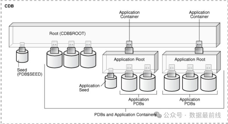 12c中引入了多租户架构,一个容器数据库(Container Database, CDB)中可以容纳多个可插拔数据库(Pluggable Database, PDB)。虽然说从架构上CDB相当于是原来的独立数据库,但Oracle期望CDB作为数据库的容器,PDB作为最小的数据库单位,可以在不同的CDB之间便利的迁出和迁入。当应用需要新的数据库资源时,只需要一条命令在CDB中创建出新的PDB即可交付使用。