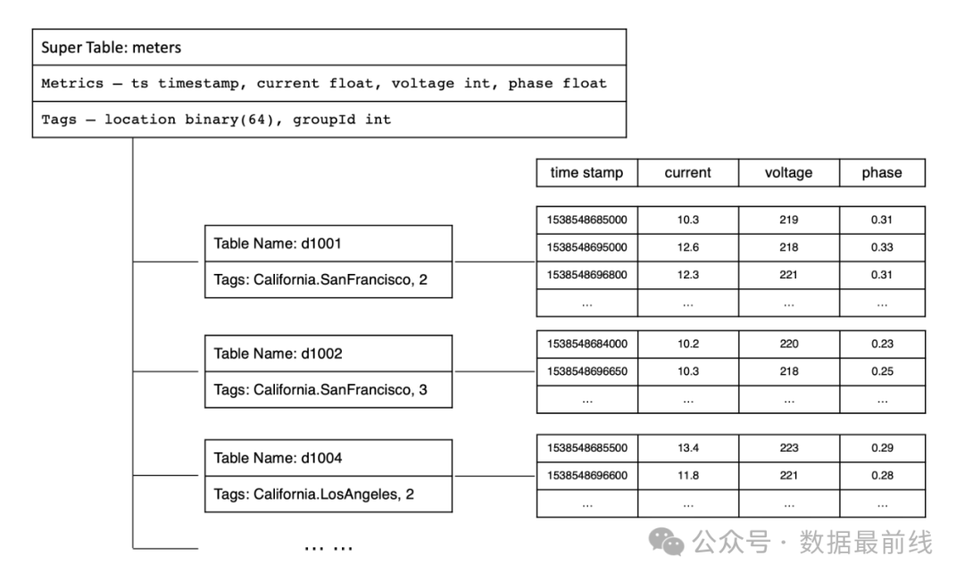 TDengine采用一个数据采集点一张表的策略,对每个数据采集点单独建表(比如有一千万个智能电表,就需创建一千万张表),用来存储这个数据采集点所采集的时序数据。同时为了解决采集表数量过多带来的管理问题,TDengine为某一特定类型的数据采集点创建集合,称为超级表。超级表除需要定义采集量的表结构之外,还需要定义其标签的 Schema。