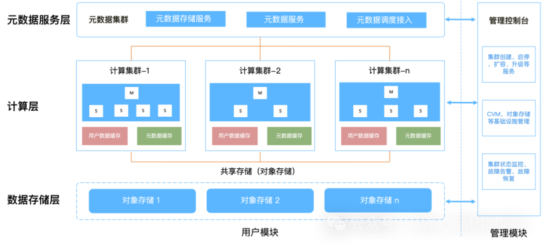 用户模块主要分为三个层次:元数据服务层、计算层以及数据存储层,每层之间完全解藕。