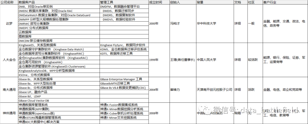 达梦、人大金仓、南大通用和神州通用并称国产数据库“四大金花”,几家公司成立于1999年到2008年之间,其创始人均有着深厚的国家科研背景,是第一代国产数据库的先行者和探索者。经过20年的发展,数据库行业也发生了深刻的变化,“四大金花”的发展也呈现出不同的形态,这里试着对这四家前辈做一个粗浅的横向比较。