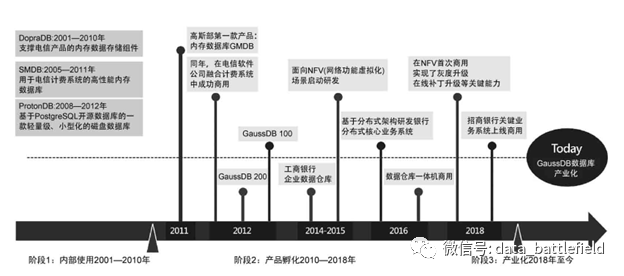 华为公司研究和开发数据库技术及产品,最早可追溯到2001年。当时,华为公司中央研究院Dopra团队为了支撑华为所生产的电信产品(交换机、路由器等),启动了内存数据存储组件DopraDB的研发,从此开启了华为自研数据库的历程。DopraDB后来随着业务和组织的切换,成为华为高斯数据库团队的GMDB V1系列产品。之后华为又研发了以内存为中心的SMDB数据库和基于PostgreSQL开源数据库开发ProtonDB,这是华为与开源数据库PostgreSQL数据库的第一次亲密接触。