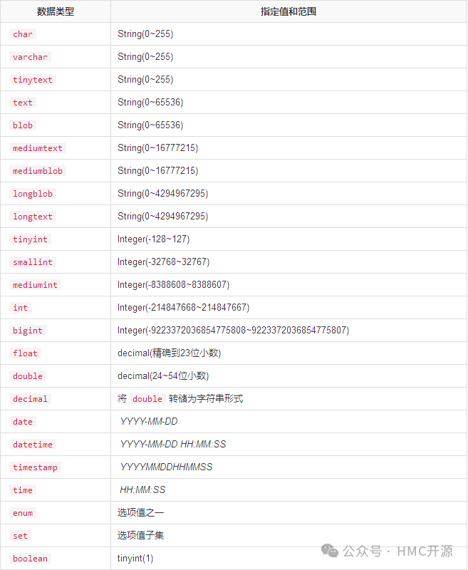 MySQL 的数值类型主要包括整型、浮点型、精确数值型等。例如,TINYINT是 1 个字节的整型,取值范围为 -128~127,TINYINT UNSIGNED取值范围为 0~255。INT是 4 个字节的整型,取值范围为 -2147483648~2147483647,INT UNSIGNED取值范围为 0~4294967295。
