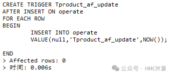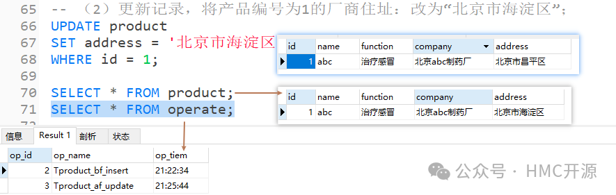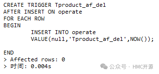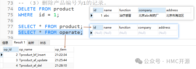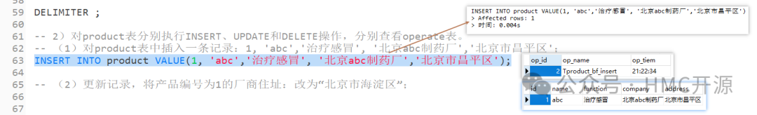 2)对product表分别执行INSERT、UPDATE和DELETE操作,分别查看operate表。
