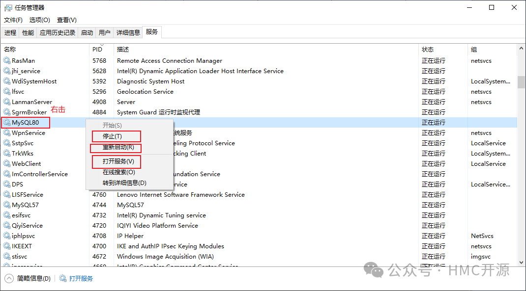 2、在服务对话框中,手动启动或者关闭MySQL 服务;