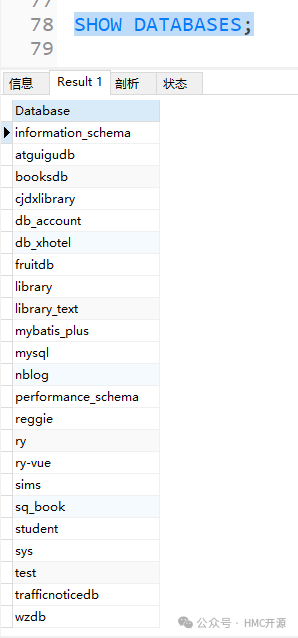 2)利用SHOW DATABASES 命令显示当前的所有数据库;