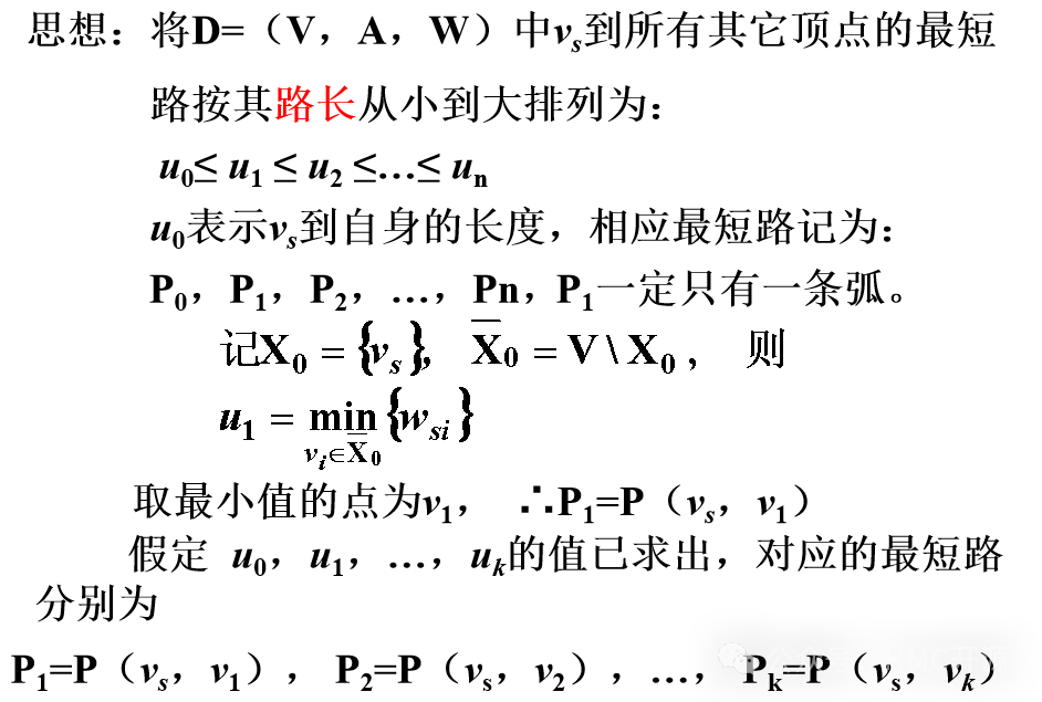 事实:如果P是D中从vs到vj的最短路,vi是P中的一个点,那么,从vs沿P到vi的路是从vs到 vi的最短路。