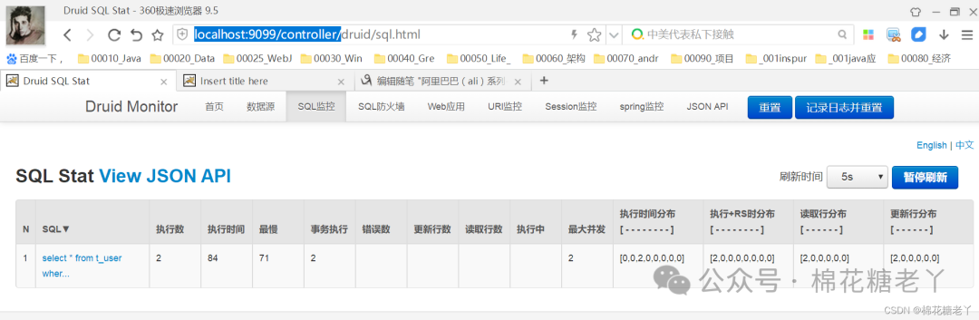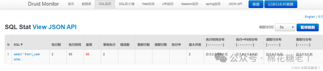 重启再去查看druid监控后台,可以看到跟原来有了一些差别,由于设置了慢sql的时间为大于50毫秒,所以执行时间大于50毫秒的都会被红色标注。