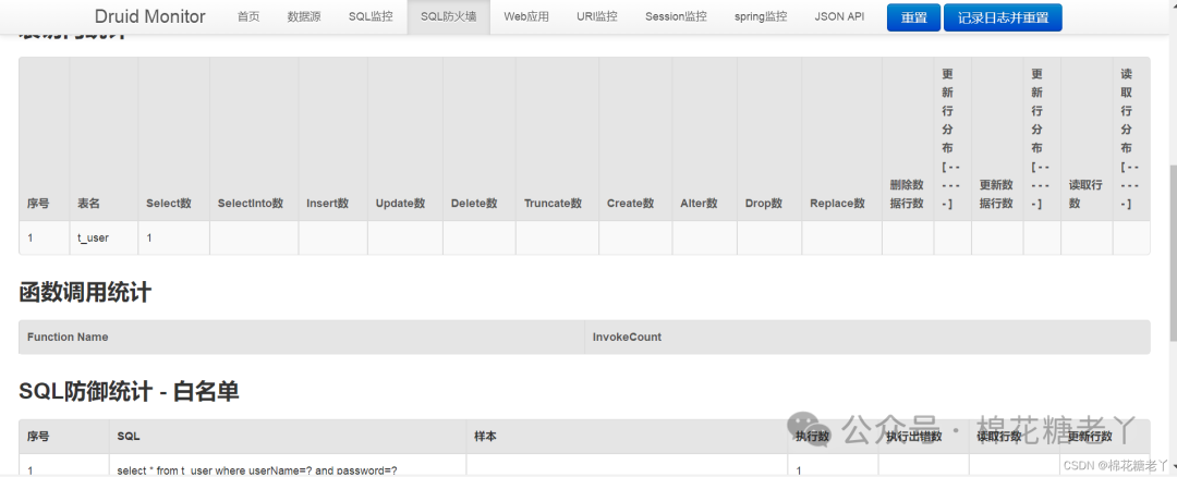 面板里是防御统计及sql的统计信息,这里用的是druid默认的一些过滤规则,并没有自定义复杂的防火墙规则,因此也不细说了。