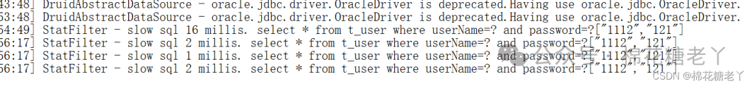 <!-- 慢SQL记录 --><bean id="stat-filter" class="com.alibaba.druid.filter.stat.StatFilter"><!-- 慢sql时间设置,即执行时间大于50毫秒的都是慢sql --><property name="slowSqlMillis" value="50"/><property name="logSlowSql" value="true"/></bean><bean id="logFilter" class="com.alibaba.druid.filter.logging.Slf4jLogFilter"><property name="dataSourceLogEnabled" value="true" /><property name="statementExecutableSqlLogEnable" value="true" /></bean>