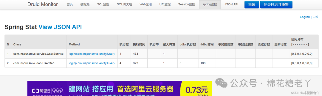 原先的做法只能对sql语句及jdbc相关操作进行监控,无法监控到代码级别的运行,因此进一步设置,结合spring的AOP特性对代码的运行效果进行监控,druid可以做到方法级别的监控,这个功能可以让你发现方法的调用频率及方法的运行时间,及时做出调整和修正使得项目更健壮。