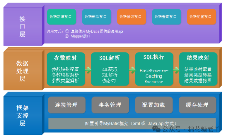 支撑层:负责最基础的功能支撑,包括连接管理、事务管理、配置加载和缓存处理,这些都是共用的东西。为上层的数据处理层提供最基础的支撑。