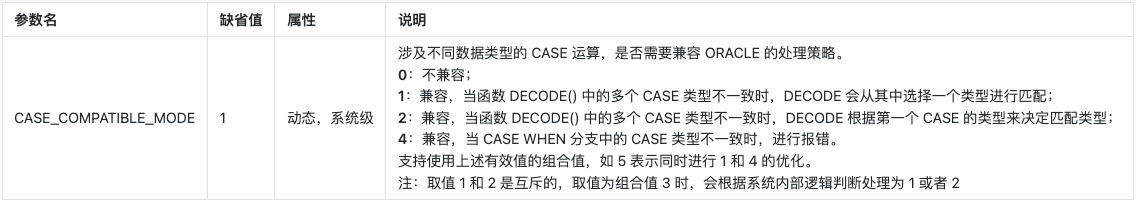 CASE_COMPATIBLE_MODE 1 0 7 1 N 1 1 Case compatible mode, 0:none, 1:Oracle(simple case), 2:Oracle(simple case new rule), 4:Oracle(bool case) SYS ALL_SYNC CAN_SYNC