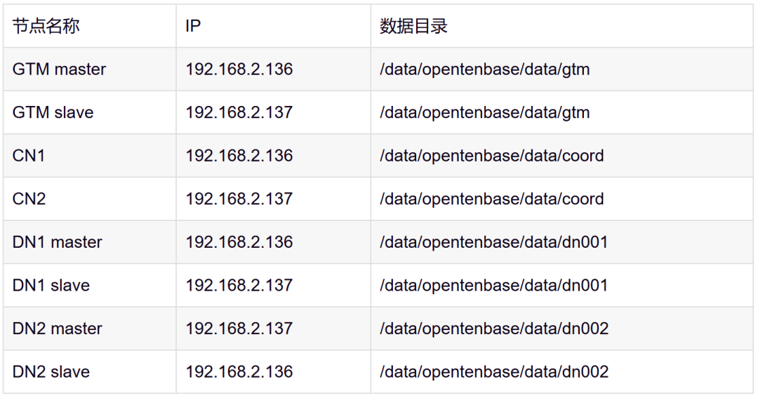 [opentenbase@db1 ~]$ psql -h 192.168.2.136 -p 30004 -d postgres -U opentenbasepsql (PostgreSQL 10.0 OpenTenBase V2)Type "help" for help.postgres=# select * from pgxc_node;node_name | node_type | node_port | node_host | nodeis_primary | nodeis_preferred | node_id | node_cluster_name-----------+-----------+-----------+---------------+----------------+------------------+-------------+---------------------gtm | G | 50001 | 192.168.2.136 | t | f | 428125959 | opentenbase_clustercn001 | C | 30004 | 192.168.2.136 | f | f | -264077367 | opentenbase_clustercn002 | C | 30004 | 192.168.2.137 | f | f | -674870440 | opentenbase_clusterdn001 | D | 40004 | 192.168.2.136 | t | t | 2142761564 | opentenbase_clusterdn002 | D | 40004 | 192.168.2.137 | f | f | -17499968 | opentenbase_clusterdn003 | D | 40004 | 192.168.2.138 | f | f | -1956435056 | opentenbase_cluster(6 rows)