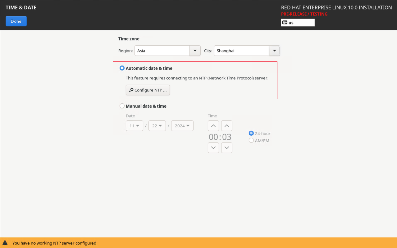这里还增加了一个 NTP 配置选项,前提是需要先配置好网络: