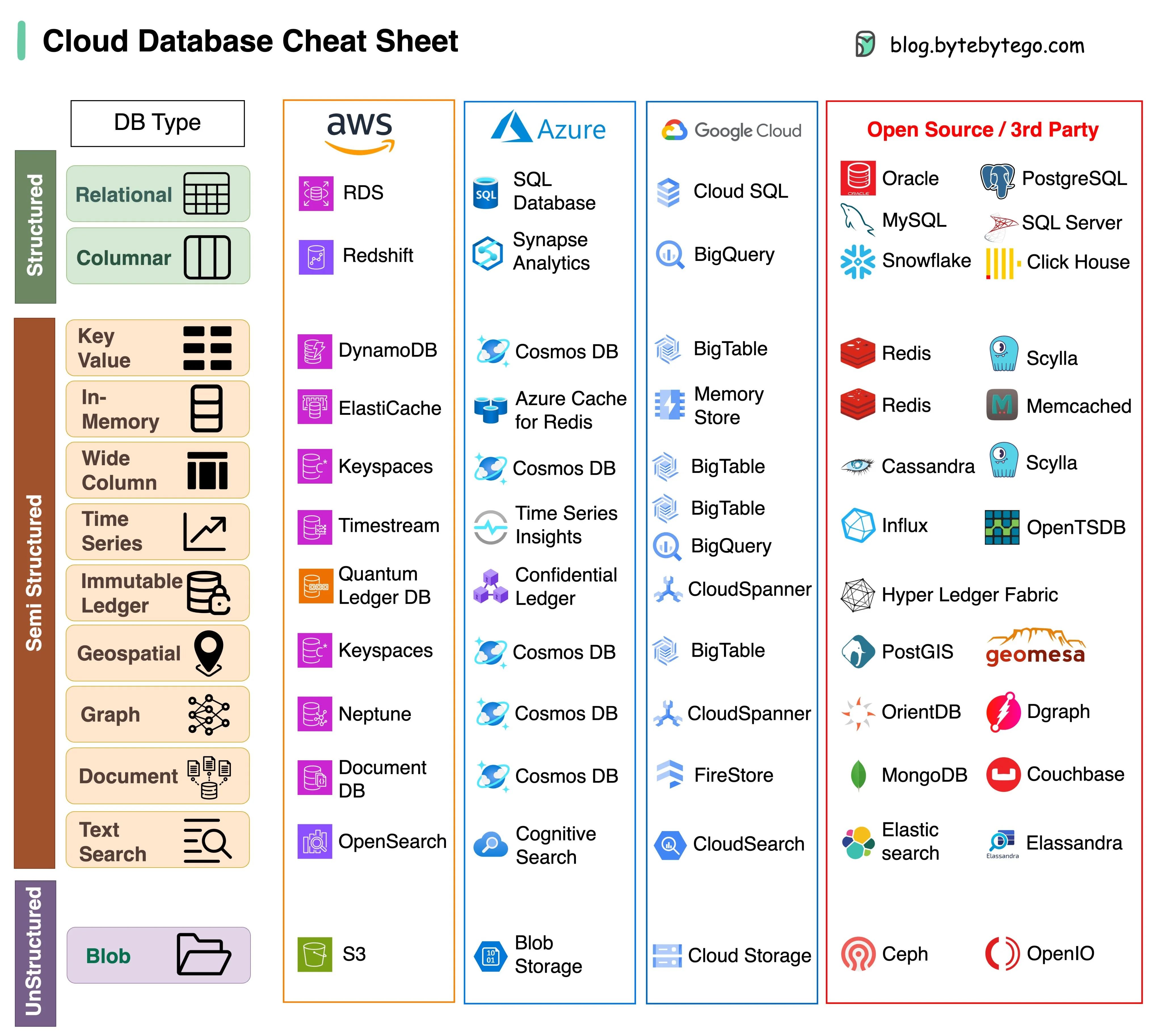 下面这张图来自于bytebytego,大家习惯了用各种类型的数据库软件,看看三大云产商有哪些对应的服务,对于这种体量的企业来说,复刻一个服务轻轻松松,真怕以后开源数据库会没了~~