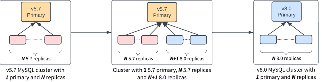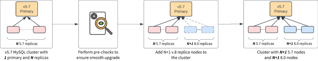 Uber的MySQL基础设施规模庞大,拥有超过2,100个集群和16,000多个节点,分布在各个区域和地区,这给我们带来了重大挑战。手动升级显然不是一个可行的选择。为了应对这一问题,我们制定了一项全面的多步骤升级策略,并行升级(Side-by-Side Upgrade),该策略可以在不同环境中高效执行,需要精心协调;最后就是减少人工干预,人工操作越多风险就越大,也说明策略不完美。