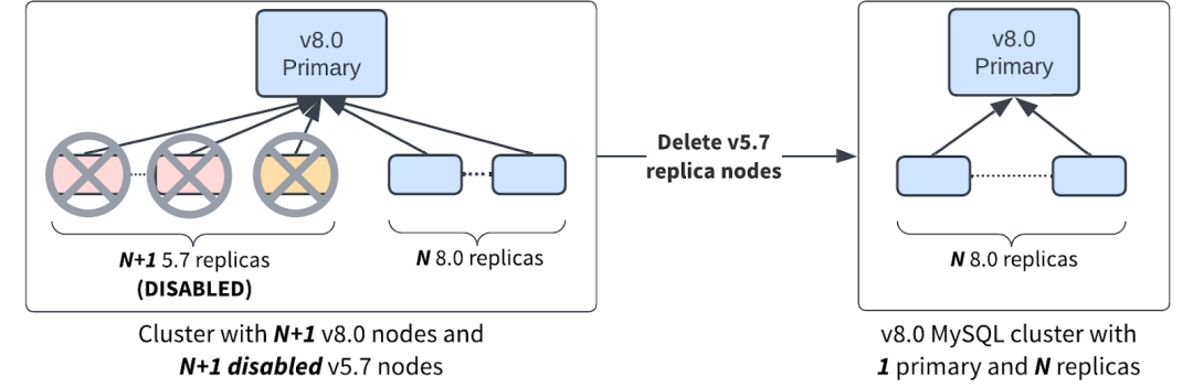 简单的说,在预维护阶段立刻删除v8.0节点,就可以回滚,但需要注意的是一旦v8.0节点被提升为主节点,对v5.7节点的复制就会停止,这一转变标志着与v5.7兼容性的不可逆点。